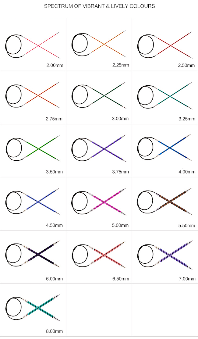 | Needle Size | 2.25mm / US 1 – 100cm / 40”, 2.50mm / US 1.5 – 100cm / 40”, 2.75mm / US 2 – 100cm / 40”, 3.00mm / US 2.5 – 100cm / 40”, 3.25mm / US 3 – 100cm / 40”, 3.50mm / US 4 – 100cm / 40”, 3.75mm / US 5 – 100cm / 40”, 4.00mm / US 6 – 100cm / 40”, 4.50mm / US 7 – 100cm / 40”, 5.00mm / US 8 – 100cm / 40”, 5.50mm / US 9 – 100cm / 40”, 6.00mm / US 10 – 100cm / 40” |